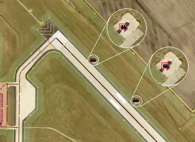 Die VASI befindet einige 100 m hinter dem Beginn der Startbahn, meist auf der linken Seite. Auf guten Satellitenbildern kann man zwei mal 2 Flutlichter erkennen. Füge in der Mitte der 2 Systeme je ein Knotenpunkt hinzu.