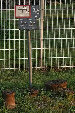 Darunter befindet sich die Positionsangabe, welche die Lage das Schieberkastens vom Hinweisschild aus beschreibt. Auf dem Beispielbild für die Wasserversorgung zeigt das Hinweisschild für den Schieber S 80 0.0, 0.5 und 0.3. Der Schieberkasten befindet sich also 50 cm vor und 30 cm rechts des Hinweisschildes. Als Schlüssel position=0.0;0.5;0.3
