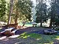 | Ein Ort, der sich zum Essen im Freien eignet, mit Einrichtungen, die ein Picknick erlauben, wie Tische und Bänke. |
