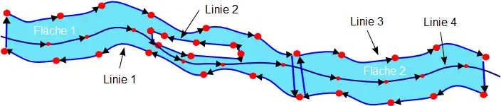 Wenn der Fluss lang ist, sollte er in überschaubare Segmente geteilt werden (Fläche 1 und Fläche 2 in der Graphik unten).