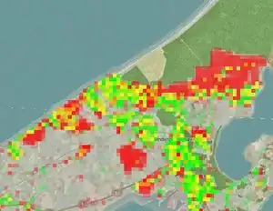 Her finder man et heatmap, der er lavet ud fra om vejnavnene tilknyttet adresse-punkterne i området også findes som selvstændige veje. Røde områder indikerer masser af adresse-punkter uden tilhørende veje.