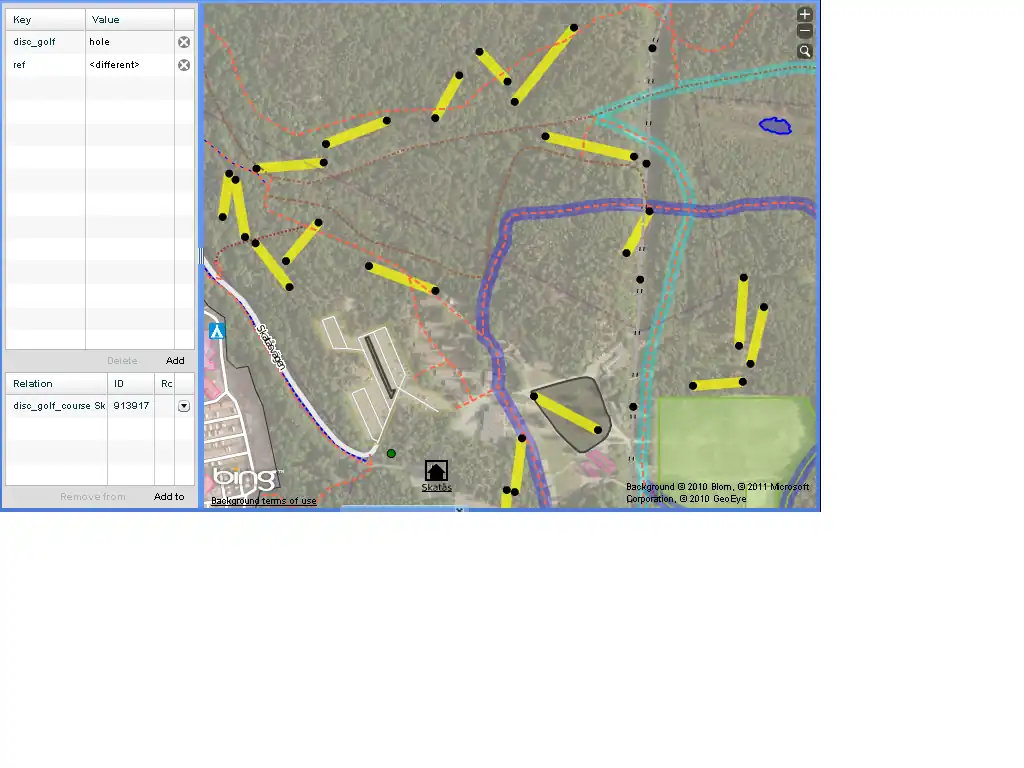 Below is an example of a disc_golf_course in the forest. Not really visible except for those looking for it. All 18 holes are tagged as ways with a tee and a basket as start and end node. Here is used the disc_golf-key: disc_golf=hole, disc_golf=tee, disc_golf=basket. all 18 holes are grouped together with a relation of the type disc_golf_course and with the name of the court and the club.https://www.openstreetmap.org/browse/relation/913917