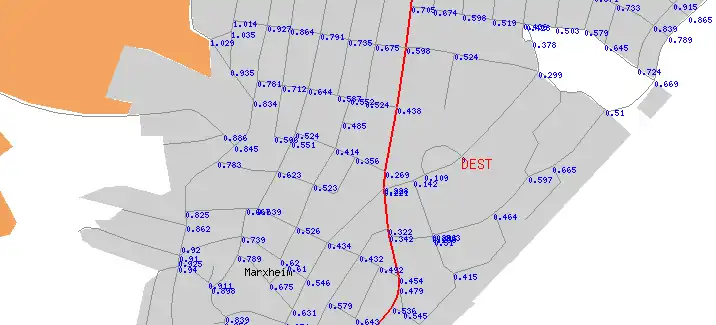 This program takes an osm file and one location/node as destination and computes and displays distance to node/destination for all other junctions in map/file. Result is PNG, SVG, GPX, OSM. Valid/usable ways can be given. Distance is calculated by an Dijkstra algorithm using only ways defined as valid. So it's not the distance along the beeline!