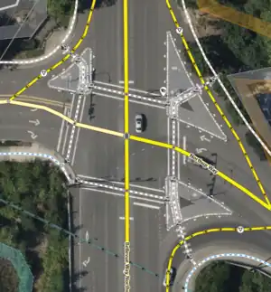 Because of how cycleway=* really three states: no added namespace, *:right=* namespace, and *:left=* namespace this tagging convention isn't truly capable of handling newer and more modern scenarios like middle of the road bike lanes (see Valencia Bikeway in San Francisco) or numerous places in Florida where right turn lanes and even on and off ramps for roads cross over bike lanes. This might seem odd but having right turning traffic cross a cycle lane in advance of an intersection is far safer than having the cyclist on the right-hand side of right turning traffic that commonly forget to check for bike/ped/disability traffic before turning. If a roadway sees the scenario commonly then move to the next section which covers 'bike lanes as lanes'.