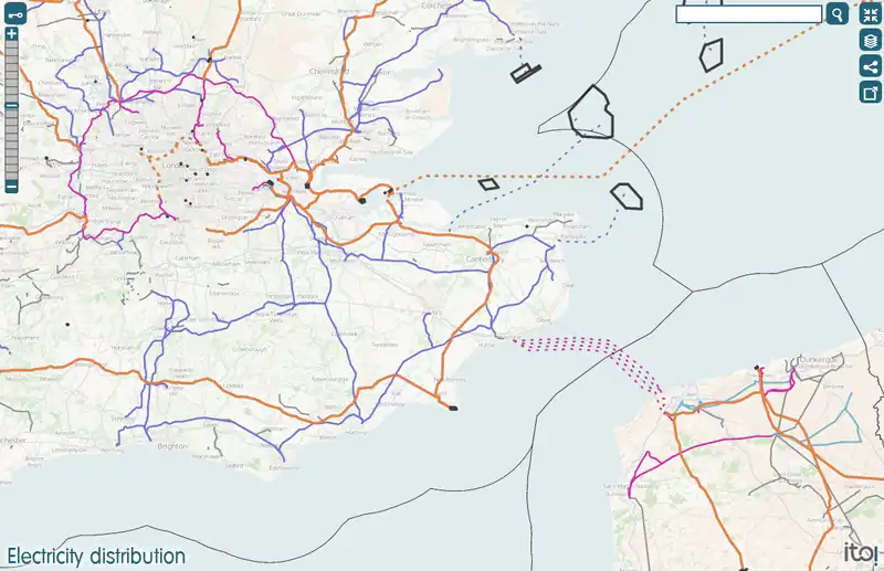 The electricity overlay map view from ITO Map showing power=line according to voltage=* (red = 400 kV+, purple = 300-399 kV, light blue = 200-299 kV, green < 200 kV).