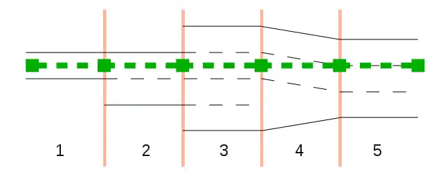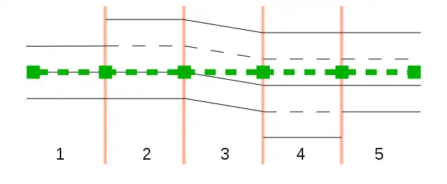 A veces, la disposición de una vía OSM cambia gradualmente del inicio al final. En lugar del valor transition, se pueden usar los sufijos :start y :end para proporcionar información sobre la disposición al inicio o final de la vía OSM. Por lo general, esto es innecesario si dicha información puede recuperarse de los registros anteriores.