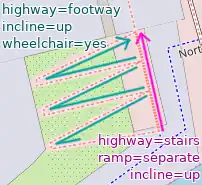 Existe una rampa que va en la misma dirección que las escaleras cerca a ella, pero están mapeadas en vías (way) separadas en OpenStreetMap. Esa vía separada se puede etiquetar con highway=footway y incline=*.