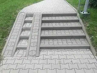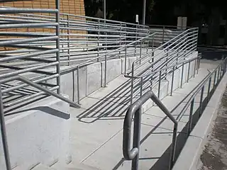Una rampa suave y superficial que puede ser usada por personas en sillas de ruedas. No deben de tener una inclinación de más de 4-6% y debe tener el ancho adecuado. | ||