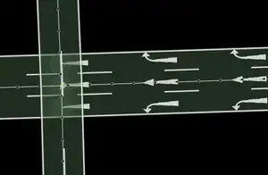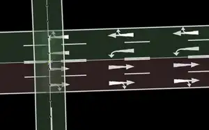 En este ejemplo existen tres carriles en un solo sentido: el carril de la izquierda gira a la izquierda, el carril de la derecha va a girar a la derecha y el carril del medio continúa directamente al siguiente cruce (sigue recto).