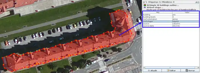 Para simplificar estos casos OpenStreeMap posee un Simple 3D Buildings|método de etiquetado 3D que se asemeja conceptualmente al modelo procedimental de edición basada en reglas CGA utilizadas en software de construcción de ambientes urbanos paramétricos como ESRI CityEngine, Autodesk Infraworks o Bentley 3D City GIS. De manera resumida, estas etiquetas determinan las características que debe tener un objeto (tipo de techo, fachadas, materiales, colores, número de plantas, etc.) y la transformación que debe sufrir para su correcta visualización en un software que entienda este "dialecto". En el caso concreto de los tejados existe definida toda una serie de gramática de formas que son muy útiles para llevar a cabo una edición mucho más rápida, obviando las confusas formas con que se intentan representar en la cartografía de Catastro.