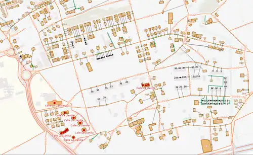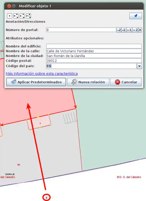 - Desde el menú Predefinidos --> Anotación --> direcciones añade al polígono de cada edificio el número de policía que se ve en la imagen de Catastro (número de color azul junto a las parcelas). Recuerda que en algunas localidades los números de policía recogidos en Catastro son antiguos por lo que si tienes la posibilidad de revisar algunos in situ o utilizando de forma puntual servicios como Google Street View para asegurarte de ello, mejor.