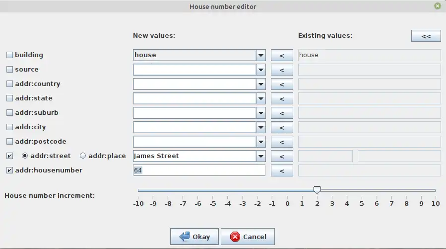 El complemento FixedAddresses que has instalado antes en tu JOSM permite corregir y estimar de manera rápida direcciones de edificio que no están correctas o no se han completado: por ejemplo, calles con nombres similares pero no iguales (Calle de Arriba --> Calle Arriba).