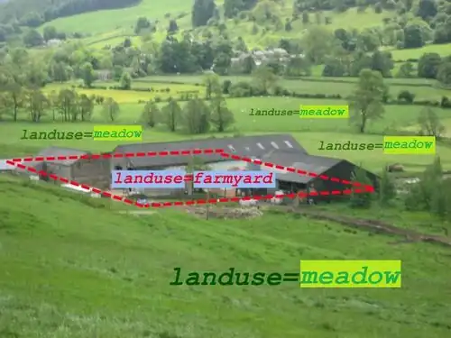 En consecuencia, la etiqueta landuse=farmland se utiliza ahora solo para las tierras de cultivo (es decir, las superficies utilizadas para la labranza y la pastura), y no para las zonas que se describen mejor como un corral.