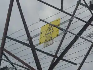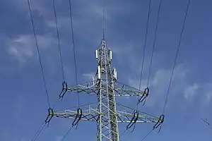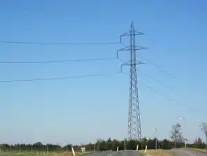 | Una torre o apoyo soportando cables eléctricos de alto voltaje. A menudo se construyen a partir de celosías de acero, pero también se utilizan apoyos tubulares o sólidos. |