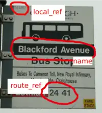 - naptan:AtcoCode: (local_ref in the picture) This is the number that is displayed on the bus stop and usually differs slightly from the AtcoCode reference See [2] and [3] for more info