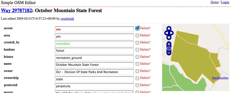 The other mode is the map mode. The map mode has an editor similar to Potlatch. By default, you can drag the map around: to select an object, click any spot on the map. The editor will download all nodes and their associated objects for 30px in each direction from the click, and display them in the map. From there, you can select a feature by clicking on it (to see its tags, in the lower left), and click 'edit' to edit the tags in the page.