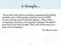 Mapping Gaza: http://wiki.openstreetmap.org/wiki/WikiProject_Palestine_Gaza. Mapping is powerful political force and no where more so then in Palestine. (paula)