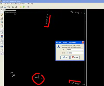 Une fois l'image découpée ou si l'option de découpage est désactivée, le plugin entre dans le vif du sujet en vous demandant d'identifier la position et les coordonnées de deux croisillons de repérage Lambert sur la feuille. Choisissez de préférence des croisillons au bord de la feuille, là où sont visibles les coordonnées Lambert et choisissez-les aussi, si possible, à des extrémités opposées de la feuille. Cliquez de manière très précise sur le milieu du croisillon, c'est extrêmement important pour la qualité de positionnement final ! Puis entrez les coordonnées Lambert correspondant à ce croisillon dans le dialogue apparaissant après le clic. Ces coordonnées correspondent à des distances en mètres et contiennent souvent un séparateur "." pour les milliers. Donc si le plan affiche "99.500", il faut taper "99500". Vous devrez entrer les coordonnées "Est" et "Nord" (East, North) en faisant attention à l'orientation de la feuille que vous lisez. En effet, sur toutes les feuilles figure une flèche indiquant le nord. Habituellement, celle-ci est pointée vers le haut de la feuille. Si c'est le cas, les chiffres en bas et en haut de la feuille sont les coordonnées "Est" et celles qui sont à gauche et à droite sont les coordonnées "Nord". Mais si la flèche indiquant le nord est orientée vers la gauche ou la droite de la feuille, l"Est" et le "Nord" sont bien entendu, orientés en conséquence, c'est-à-dire que les coordonnées "Est" se retrouvent à gauche et à droite, etc.