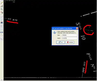 • lors de l'étape de géoréférencement, le dialogue d'entrée des coordonnée n'est plus "modal" (c.a.d qu'il est possible de zoomer et déplacer l'image de fond pour pouvoir lire les chiffres sur les bords du plan)