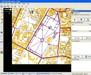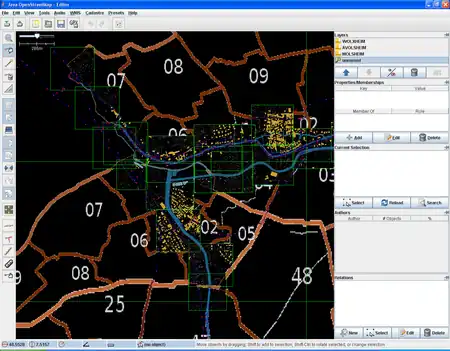 • Si vous n'êtes pas sur place ou n'avez pas de GPS, il est possible d'utiliser les données déjà présentes dans OSM par JOSM. Par exemple en utilisant les points marquant les croisements de route. Les coordonnées du point sont dans les propriétés de la sélection. Il est aussi possible d'utiliser les coordonnées du curseur affichés en bas. Cette méthode est assez imprécise car seul les quatre premiers décimaux après la virgule sont affichés. Il est toujours possible de déplacer les plans "image" manuellement pour plus de précision (voir ci-dessous). Depuis la révision 3067, il est possible d'afficher les coordonnées projetées (Préférences->Projection->Afficher les coordonnées en "Projected Coordinates"); c'est précis et cela ne demande pas de conversion depuis WGS84.