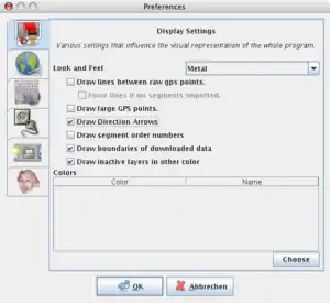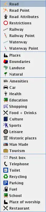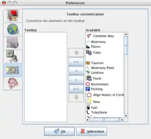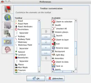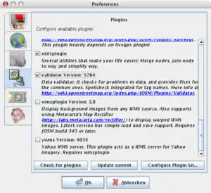 Vous trouverez d'autres informations ici (en anglais) avec, entre autres, quelques paramètres à modifier lors du lancement lorsqu'on utilise de grandes quantités de données. PréférencesAvant de commencer, vous devez procéder à quelques réglages. Ouvrez d'abord la fenêtre des préférences, dans le menu "Edit", "Preferences": ![]() Sélectionnez les paramètres par défaut comme indiqué ici (cliquez sur l'image pour voir les détails): ![]() Sur la deuxième page, entrez l'URL de la base de données d'OpenStreetMap (https://www.openstreetmap.org/api), le nom d'utilisateur et le mot de passe du compte que vous aurez créé au préalable sur le site d'OpenStreetMap (attention: le wiki utilise un compte différent): ![]() Sur la troisième page, activez le bouton "Tagging Presets". Cela vous facilitera vos premiers pas dans l'édition. ![]() Sur la quatrième page, cliquez sur le bouton "Check for Plugins". JOSM va alors récupérer sur le réseau la liste actuelle des Plugins disponibles: ![]() Nous vous recommandons d'installer les Plugins suivants comme indiqué sur l'image: ![]() (NDT: personnellement, je n'active pas le plug-in MapPaint qui surcharge trop l'affichage. Pour désactiver un plug-in, il suffit de le désélectionner dans cette liste et de redémarrer JOSM). Allez dans la deuxième partie de la liste en utilisant la barre de défilement vertical à droite et ajoutez encore ces Plugins: ![]() Sur la page suivante, vous pouvez adapter la barre d'outil à votre goût ou vos habitudes de travail: ![]() Cliquez sur le bouton avec les double flèches vers la droite pour vider la barre d'outils: ![]() Sélectionnez sur la partie droite l'outil que vous désirez voir dans la barre d'outils puis cliquez sur la flèche vers la gauche pour l'ajouter à votre barre d'outils. Vous pouvez changer l'ordre des boutons de la barre en utilisant les flèches haut et bas: ![]() Avec ces paramètres, vous devriez être capable de bien débuter avec JOSM. Bien sûr, vous pourrez les changer plus tard pendant vos travaux. Quittez la fenêtre des préférences. Pour pouvoir prendre en compte les nouveaux Plugins, JOSM a besoin d'être redémarré. DémarrageAprès le redémarrage, JOSM devrait ressembler à ceci: ![]() Pour commencer, chargez votre fichier trace pour activer l'écran principal. Sélectionnez le menu "File", "Open" (raccourci Ctrl+O): ![]() Sélectionnez le fichier trace dans le dossier approprié sur votre disque dur. Vous pouvez charger plusieurs fichiers simultanément en les sélectionnant tout en appuyant sur la touche Ctrl : ![]() Vous voyez maintenant la trace et éventuellement les points à l'écran: ![]() Sur la partie gauche de l'écran se trouve, en haut, les boutons pour modifier les données et, en dessous, une série de boutons qui permettent de rendre visible ou de masquer plusieurs petites fenêtres sur la partie droite. Certaines de ces petites fenêtres étant très utiles, vous pouvez commencer par ouvrir celles correspondant aux boutons suivants: ![]() Maintenant, vous devriez voir quelque chose comme ceci: ![]() Le panneau "Layers" donne la liste des calques en cours d'utilisation dans JOSM. D'habitude, un calque existe pour le fichier trace GPX et un autre pour les données OSM. La première fois que vous ouvrez un tracé, il apparaît en gris. Il est quasi indispensable de choisir une couleur plus "flashi" lorsque vous superposerez ce calque avec celui des données OSM. Pour cela, cliquez avec le bouton droit de la souris sur la ligne identifiant le calque de trace GPX dans le panneau "Layers", ouvrant un menu contextuel. Sélectionnez le menu "Customize Color" et choisissez une couleur très voyante (en général vert, rouge, violet ou jaune clair par contraste avec le bleu sombre utilisé dans le calque de données OSM). Vous pouvez aussi choisir dans quel ordre les calques sont affichés ou choisir de rendre temporairement invisible un calque. Commandes de baseCliquez et gardez le bouton droit de la souris pour pouvoir déplacer l'espace de travail. Utilisez la molette de la souris pour zoomer en avant et en arrière. Assurez-vous que votre zone de travail ne soit pas trop grande, quelque chose comme un kilomètre carré. Si votre trace est trop grande, travaillez sur une partie restreinte pour commencer. Apprenez à utiliser les raccourcis claviers, principalement A, S et D, malheureusement mal adaptés au clavier français. Votre plan de travail devrait ressembler à ceci maintenant: ![]() Charger les données OSMMaintenant, vous devez interroger le serveur OSM pour voir s'il contient déjà des données pour cette zone. Sélectionnez le menu "Connection", "Download from OSM" ou cliquez sur le bouton approprié de la barre d'outils: ![]() ![]() JOSM calcule automatiquement la zone qu'il doit charger depuis OSM en fonction de la vue actuelle (longitude, latitude et niveau de zoom). Activez l'option "OpenStreetMap data". Cliquez ensuite sur le bouton "OK" pour lancer votre premier téléchargement du serveur OSM: ![]() Pendant le traitement de la demande, vous voyez le dialogue suivant: ![]() Au cas où le serveur serait en maintenance ou que la charge de travail est trop importante à ce moment là, il est possible que votre demande ne soit pas traitée. Bien que cela arrive rarement, il faudra alors attendre un peu et refaire la demande. A la fin du chargement des données, votre écran devrait ressembler à ceci: ![]() Premiers pasVous travaillez maintenant avec des données qui se trouvent localement sur votre ordinateur. Quand vous modifiez ces données, celles-ci ne sont pas directement sauvegardées dans la base de données du projet. Vous pouvez tirer profit de ce point pour tranquillement étudier ou modifier les données sans risque. Tant que vous ne transférez pas vos nouvelles données vers le serveur, vous pouvez utiliser l'éditeur en toute liberté. Sélectionnez maintenant le bouton pour passer en mode "déplacements" "select, m