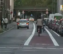 En France, les bandes cyclables (panneaux B22a ou C113) sont de manière réglementaire interdites à la circulation pour les véhicules motorisés. Si les bandes cyclables ont une ligne de séparation discontinue en France, ces lignes peuvent être continues dans d'autres pays. |