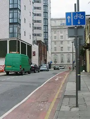 Cas d'une voie cyclable avec flux en sens contraire située à droite d'une rue à sens unique dans un pays avec conduite à gauche :