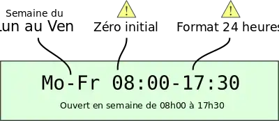 La syntaxe générale est : wd hh:mm-hh:mm (ex :, > Fr 08:30-20:00).