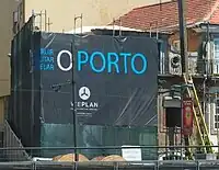 Un bâche publicitaire, supportée par un échafaudage. |