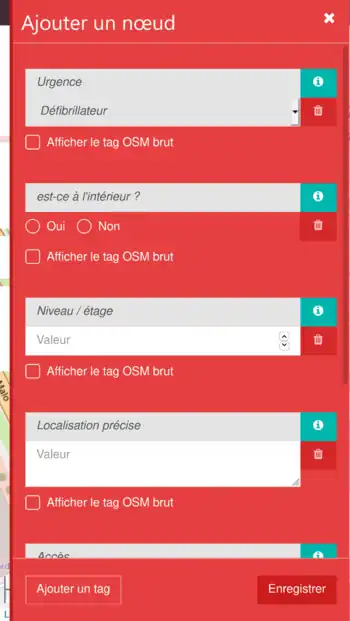 - On utilisera les tags indoor=yes/no (intérieur/extérieur), level=0/1/2/... (niveau), defibrillator:location=À côté de la porte d'entrée... (description du cheminement)