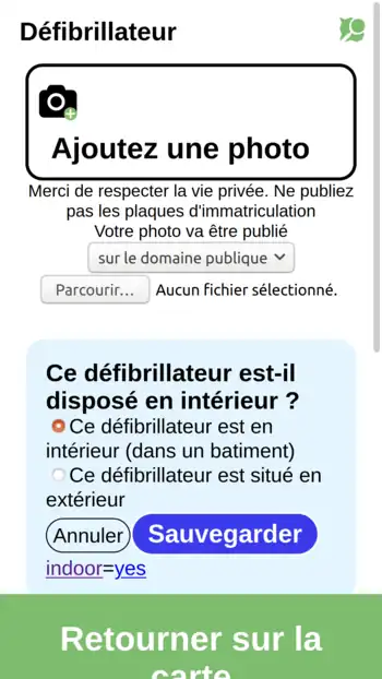 Des questions vous seront posées pour compléter les attributs des défibrillateurs. Il est également possible d'ajouter une photo pour faciliter la localisation :