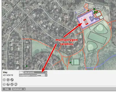 - En général, une relation multipolygon peut être employée pour construire des polygons multiples selon les standards OGC (http://www.opengeospatial.org/standards/sfs). Tout objet qui n'est pas un polygone multiple selon ce standard (exemple : des polygones avec des anneaux qui s'intersectent) doivent être considérés comme non valides à l'exception des anneaux internes adjacents (voir plus bas).
