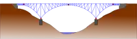 Le viaduc du Viaur a été ouvert à la circulation en 1902. La structure est constituée d'un arc à trois charnières dont les parties sont conçues pour former des porte-à-faux symétriques. De courtes poutres de suspension sont reliées à l'arche. | ||