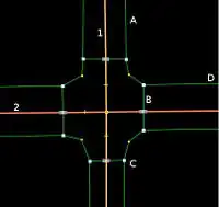 Dans cet exemple, si vous utilisez les relations, vous devriez créer une relation avec "1" en tant que street et les trottoirs qui y sont parallèles en tant que sidewalk. Dans le cas présent, les morceaux constituant le passage piéton peuvent être ajoutés dans la relation de chaque rue, toujours avec le rôle sidewalk. Les morceaux courbés de trottoirs de l'intersection peuvent être ajoutés à la relation de chaque rue (rôle sidewalk). Il en est de même pour la rue "2". |