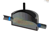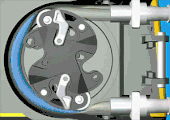 Cet exemple est destiné à montrer un couplage mécanique entre un moteur électrique et une pompe centrifuge. La pompe comme son moteur sont à l'arrière du carter bleu. |