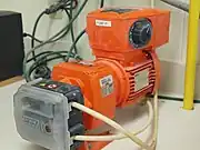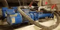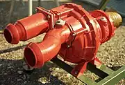 Une pompe centrifuge axiale propulsée par un moteur électrique. Les pompes centrifuges peuvent parfois être installés dans l'axe des canalisations, réduisant ainsi les efforts axiaux sur le moteur. |