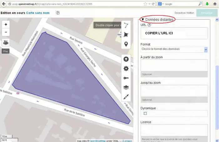 - Ajoutez dans l'url le lien précédemment construit avec la requête sur les données. Sélectionnez le format osm et cochez l'option dynamique. Si les données recherchées sont denses dans OpenStreetMap, pensez à limiter le chargement de ces données sur des zooms élevés (zoom 16 par exemple).
