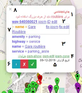 - edit – پیوندی به ویرایشگر داخلی Osmose برای ویرایش تگهای این عنصر. با کلیک روی این گزینه، کادری در سمت راست نقشه باز میشود.