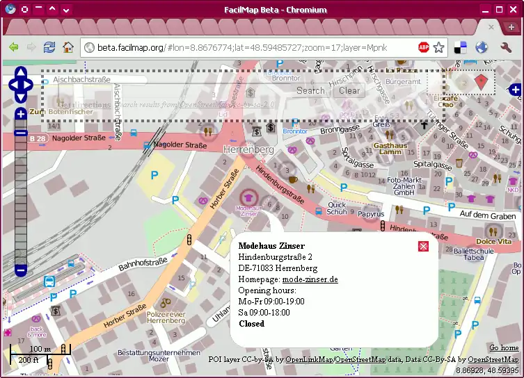 Using the POI layer from FacilMap/Version 1, you can make POIs on the map clickable. A popup will open displaying various details about the POI. FacilMap uses OpenLinkMap for this.