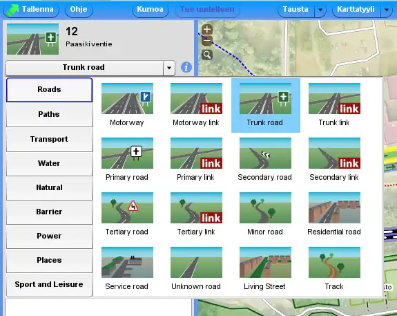 - Valitse onko kyseessä ajorata (Roads), pyörätie tai jalkakäytävä (Paths), vesiväylä (Water), rauta- tai kiitotie (Transport) tai kenties joku muu.