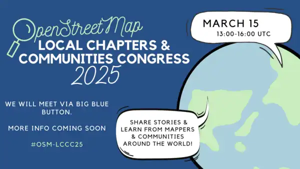 AboutThe Local Chapters and Communities Congress 2025 (LCCC 2025) is a virtual event where leaders and members of various OSM communities, whether they are officially recognized Local Chapters of the OSM Foundation or just a regular user group of OSM mappers, come together to share stories and learn from each other. Let’s get together and see what kinds of organizational efforts we can share together to support and grow our mapping communities! Check out the program from 2022 and 2024, and the event recordings! When