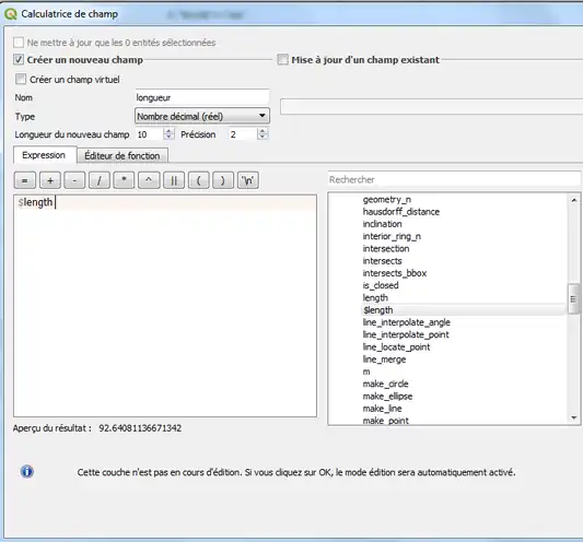 Vérifiez que le case « ajouter un nouveau champ » est cochée. Appelez votre nouveau champ « longueur » et donnez-lui le type réel avec pour longueur 10 et précision 2. Dans « expression » tapez $length ou cherchez cette expression dans « géométrie » :
