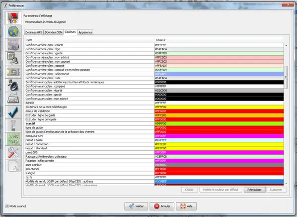 Par défaut, les tracés importés sur OSM apparaissent en gris quand ils ne sont pas actifs ce qui rend leur visualisation difficile. Pour corriger ce problème, rendez-vous dans les préférences de JOSM (Edition/préférences ou F12). Dans l’onglet « couleur », trouvez la valeur « inactif » et attribuez-lui la couleur de votre choix en cliquant dans la colonne « couleur » :