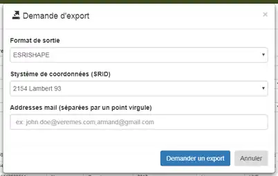 Pour permettre l’import et le traitement des données dans QGIS, on va sélectionner le format ESRISHAPE (.shp) et le système de coordonnées Lambert 93. Entrez votre adresse mail et demandez un export. Si vous souhaitez directement importer les données sur JOSM, vous devez choisir le format GeoJSON et le système de coordonnées WGS 84.
