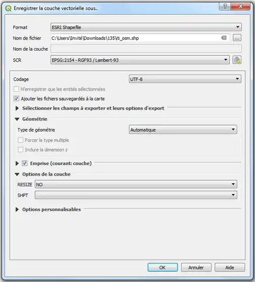 Le tracé de l’itinéraire s’affiche. Pour éviter les problèmes de compatibilité, on va convertir cette couche en shp. La couche a pour système de coordonnées le WGS 84, pour les traitements ultérieurs nous allons la convertir en Lambert 93. Ces deux opérations s’effectuent en faisant un clic droit sur la couche puis « enregistrer sous ». Choisissez le format shp et le système de coordonnées Lambert 93 :
