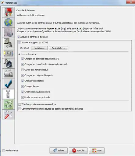 Sélectionnez l’onglet « Utilisez le contrôle à distance » puis cochez la case « Activez le contrôle à distance ». Cette fonction vous permettra de commander l’import de données dans JOSM à partir du wiki OSM.