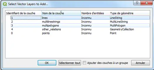 Importez votre fichier osm comme une nouvelle couche. Une fenêtre s’ouvre vous demandant de sélectionner le type d’implantation à importer. Sélectionner « lines » :