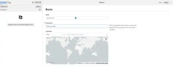 Filtereinstellung in OSMCha für Changesets, die das barrierefreie Routing für den Kirchentag 2019 in Dortmund betreffen.
