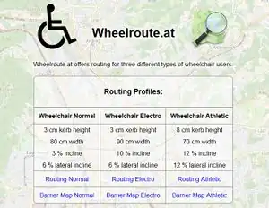 Das Portal Wheelroute.at [50] bietet Rollstuhlrouting für drei verschiedene Arten von Rollstühlen.