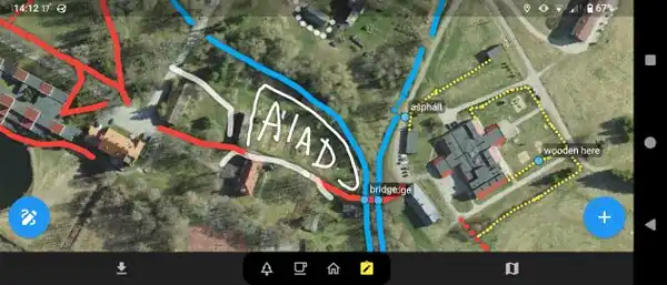 Besides the graphical scribbles, you can also add labels, which are similar to OSM notes but do not have the same workflows, and are meant to complement the context provided by the drawings — for example, including the text “asphalt” next to your drawing.